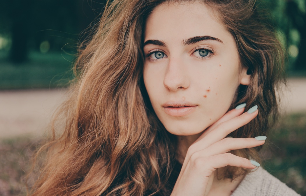 Portrait of a beautiful authentic curly-haired girl in the park in a light beige sweater with blue eyes and birthmarks on her face. No makeup.